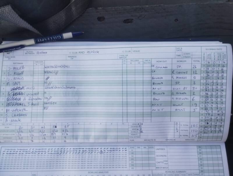 After an extremely tight spell from Joey P, who bowled five overs and 1/6, Josh and Ash set about making more breakthroughs. Josh bowled through the gate on a couple of occasions, taking important wickets at times when it appeared as though Alfrick might be finally building a platform. Ash, meanwhile, was getting through his overs like nobody's business and applying pressure while also taking wickets too.