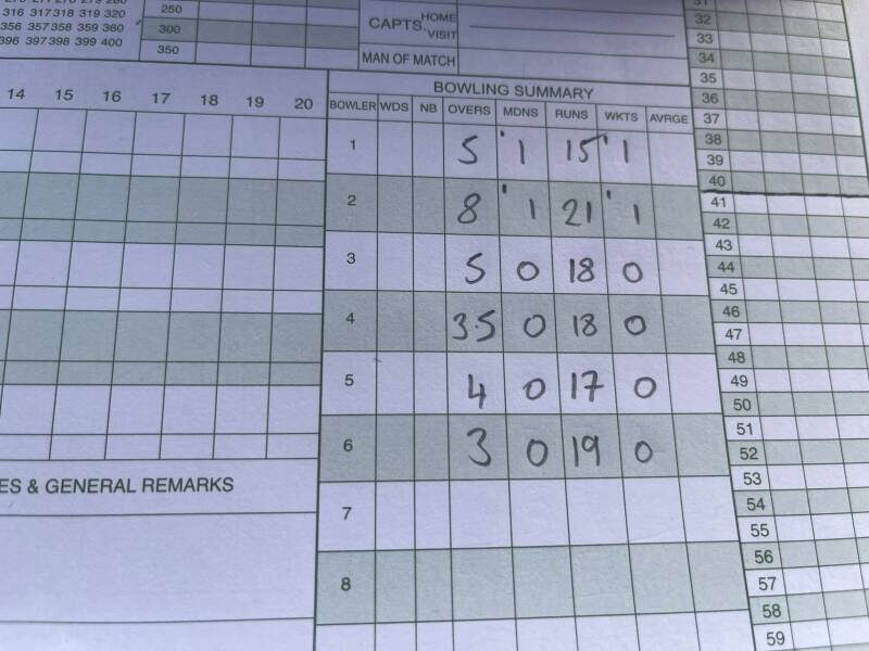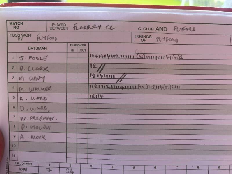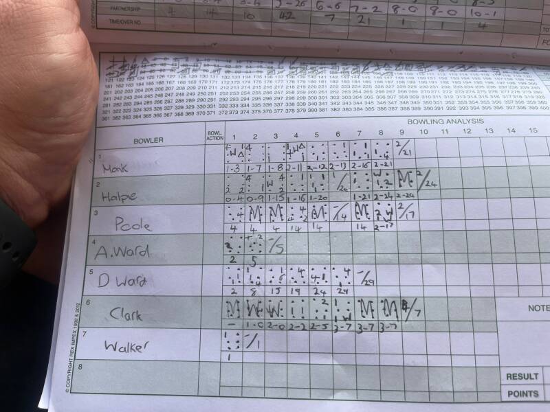 Mention in dispatches due to Aaron Monk 8 overs no maidens 2 for 21, Pete Holpin 8 overs 1 maiden 2 for 24, Joey Poole 7 overs 4 maidens 2 for 17. Also thanks is due to Dickson and Andy Ward stepping in last minute, Andy restricted to only two over no wicket for 5 and Dickson who from your correspondents view behind the stumps deserved a better return that 6 over none for 29. Unfortunately for Dickson he did come up against Fladbury’s only real biffer!