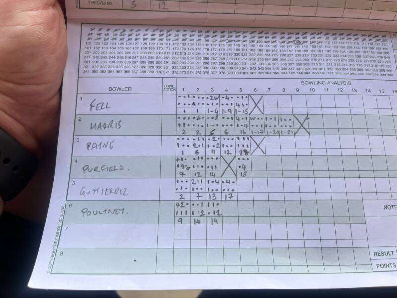 Praise is due to all the bowlers as they stuck as doggedly to the agreed approach of bowl tight and not give anything away. As few surprises in Flyford bowling these days as there are surprises in the Labour manifest. Keep putting it on a line and length, make the batsmen work for their runs and wickets will inevitably fall.