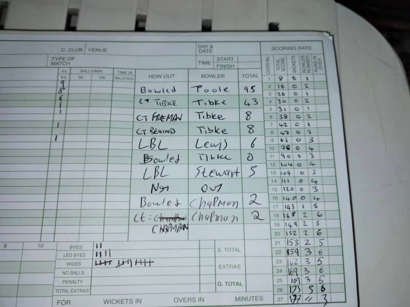I cannot stress enough the resolve shown by all the Flyford bowlers and fielders despite a couple of difficult chances going down, the Flyford heads never did. Scritty bowled much better than his figures of 48/0 from 7 indicates. He and Chappers taking the brunt of a brutal assault by the Sportsman skipper Waqas, who was eventually clean bowled by skipper Joey Poole for 95. Joey ending on 1 wicket for 7 from 5 overs. Matty Stewart and Jordan Lewis both bowled with great heat on a difficult afternoon 1 for 53 and 1 for 57 respectively.