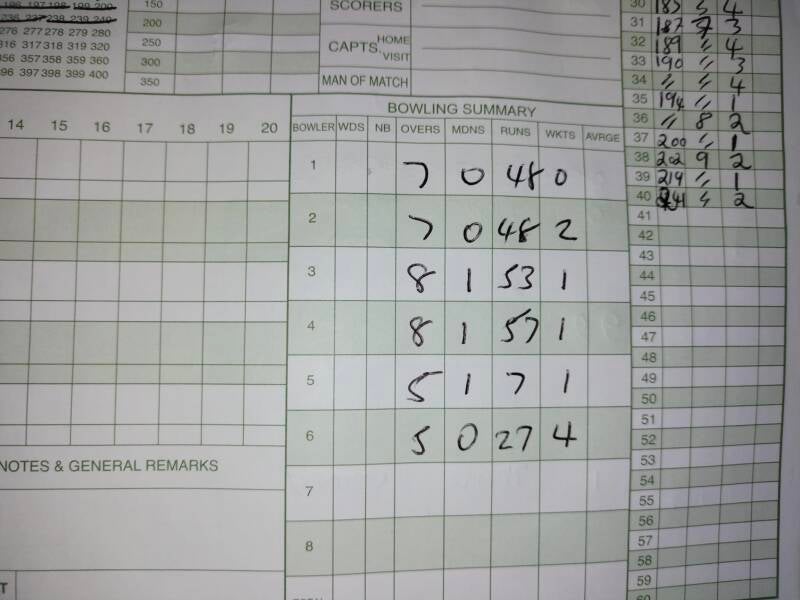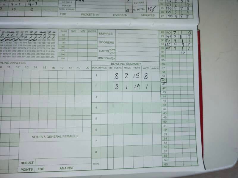 Simon ended with a very creditable 4 for 27 from 5 overs and special mention has to go to Chappers excellent caught and bowled taken with his wrong had, a catch that would have graced any ground at any level.